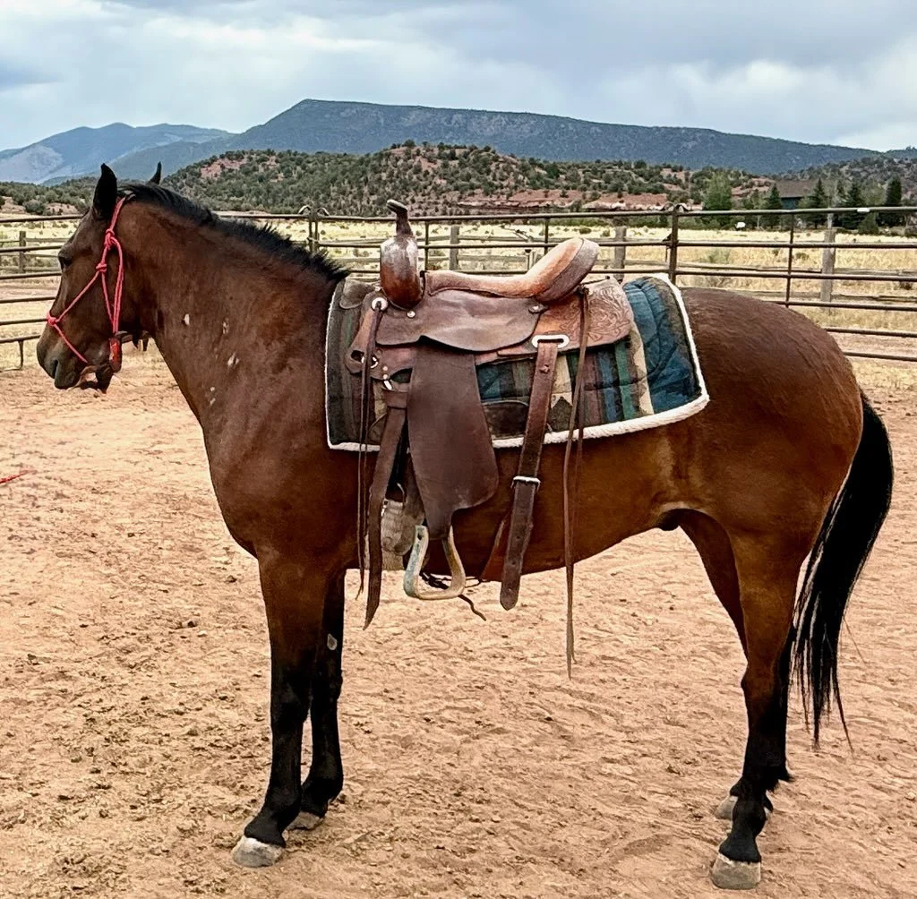 Shadow is a 22 year old dark bay mare who was ready to retire from her ranch work. She has some lameness since she arrived that we are watching closely and will evaluate with our vet. She is otherwise healthy and cute as a button. We look forward to finding Shadow a sweet retirement home, perhaps with a little kid of her own as we hope her to become a light riding horse.