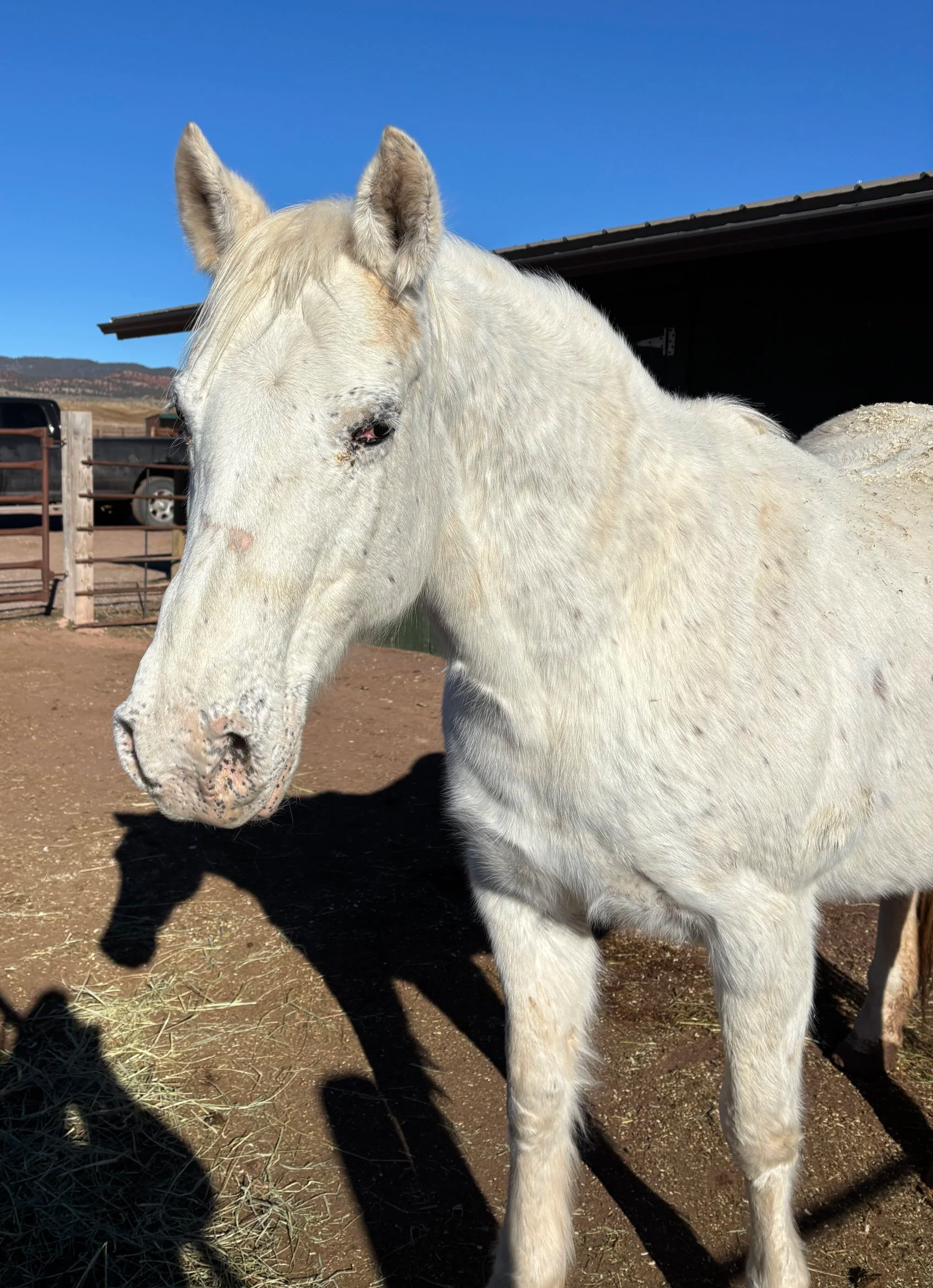 Six of them came tumbling off the trailer, one after another into MVHR quarantine pens. Each a little different - color, body type, but each showing their own signs of years of neglect….one older gelding and a beautiful black mare severely emaciated, with hip bones jutting out; two with grossly overgrown feet on which they staggered into their corrals, one with the discombobulated hind end movements of a horse with neurologic issues; and one unique gray mare with a smattering of perfect freckles on her nose who headed straight to the back of her pen, as far away from people as she could get.